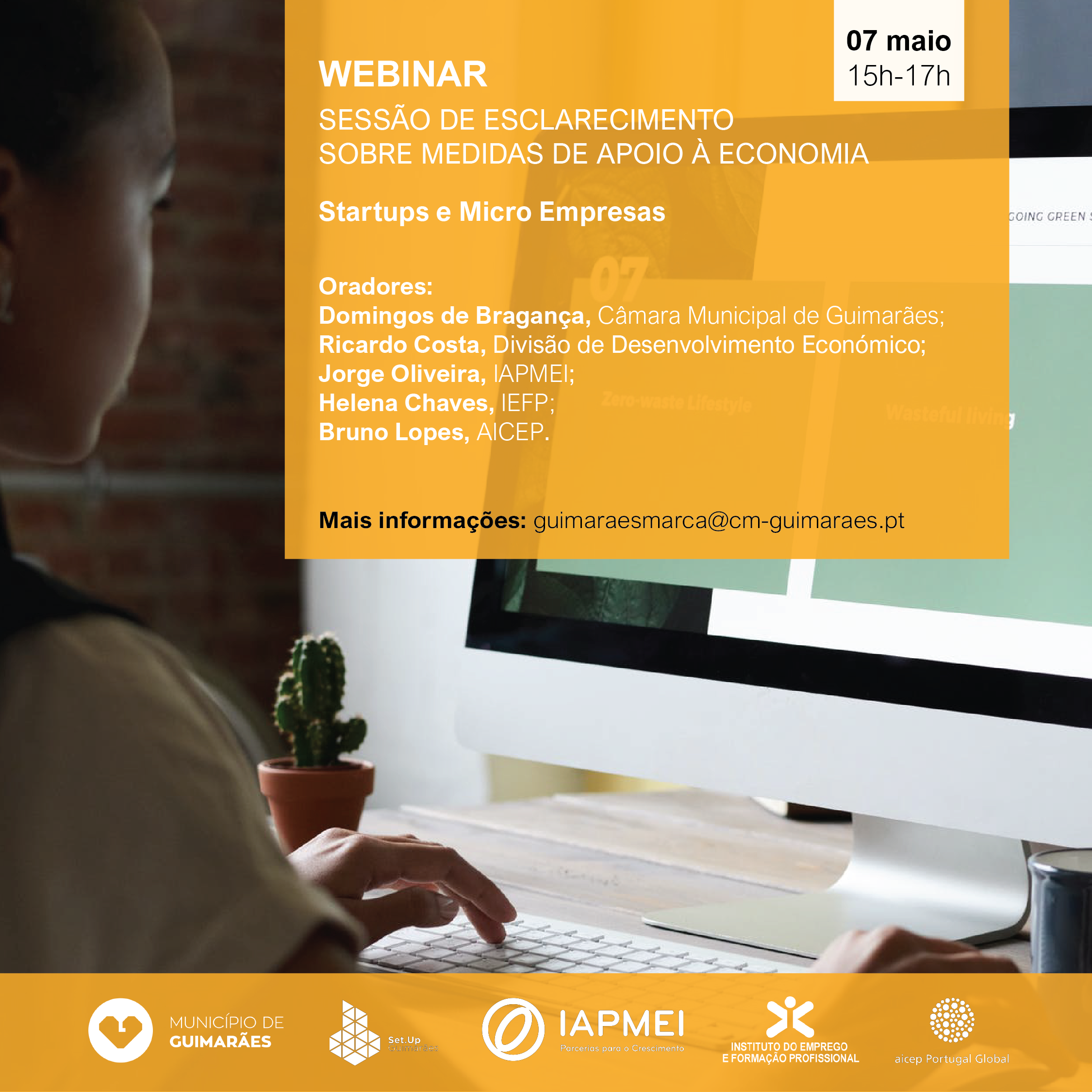 Nesse sentido, o Município de Guimarães organiza o Webinar para dinamizar uma sessão de esclarecimento online, dedicada essencialmente às Startups e Micro Empresas.